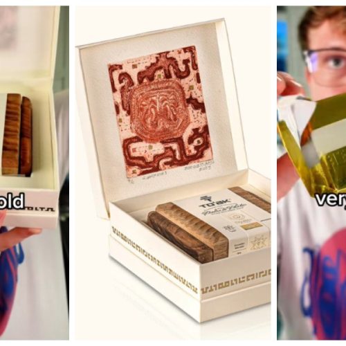 Item de edição limitada vem em embalagem em madeira com artes exclusivas Em uma embalagem quadrada de papel, envolta por
