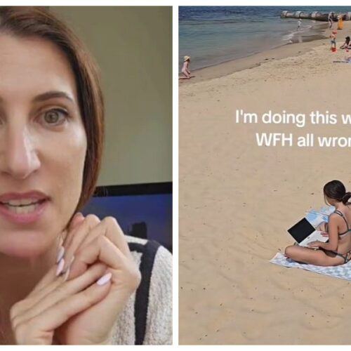 Colaboradoras aparecem na publicação de biquíni e digitando em seus notebooks Um vídeo de duas mulheres trabalhando de biquíni com