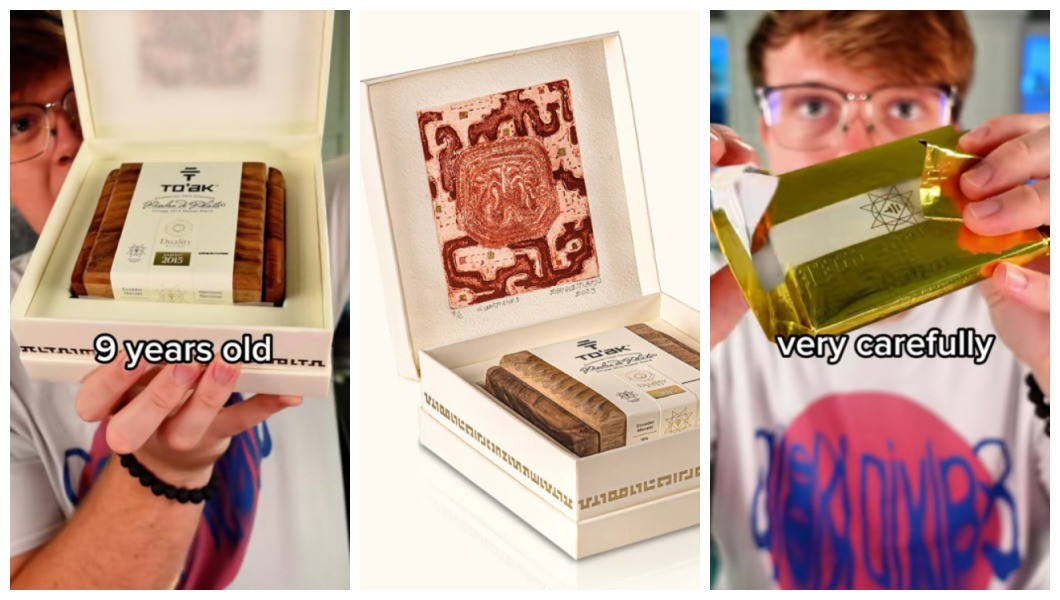 Item de edição limitada vem em embalagem em madeira com artes exclusivas Em uma embalagem quadrada de papel, envolta por ilustrações, detalhes e madeira, o chocolate de luxo da marca To’ak é um objeto de desejo por fãs do alimento. O jovem Kyle Kruger, produtor de conteúdo digital, publicou um vídeo provando o chocolate, que custou US$ 490 (aproximadamente R$ 2,5 mil). O vídeo foi originalmente postado no ano passado, mas ressurgiu nas redes sociais por ocasião do Dia Mundial do Chocolate, celebrado na última segunda-feira (07/07).