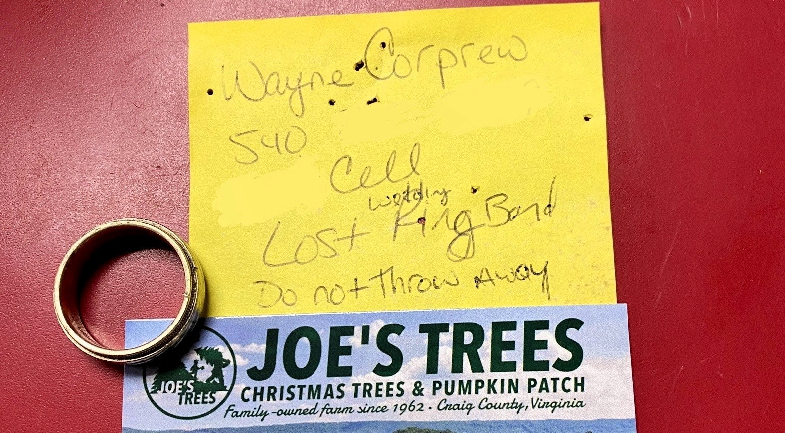 O acessório foi perdido por um cliente em 2010. Mensagem ajudou objeto a retornar para seu dono, mas uma mudança ocorreu nesse meio tempo Era 2010, o norte-americano Wayne Corprew cortou uma árvore de Natal para celebrar a data com a família em uma fazenda especializada no estado da Virgínia, nos Estados Unidos. No entanto, ao chegar ao carro, notou que sua aliança de casamento havia desaparecido. Na época, o caso foi reportado a Sue Bostic, então dona da fazenda de 20 hectares. Ela anotou o nome e o telefone de Corprew em um bilhete, caso um dia encontrasse o objeto.