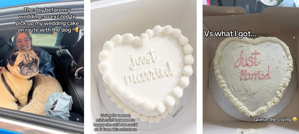 A noiva decepcionada, Georgia Walker, recorreu ao TikTok para compartilhar a situação em uma sequência de fotos. Na primeira, ela aparece feliz indo buscar o bolo de casamento. Na imagem seguinte está a referência: um bolo inteiramente branco com poucos detalhes e a frase “Just Married” (“recém-casados”, em português). A terceira imagem mostra o bolo que a noiva recebeu: com cobertura desigual e as letras em rosa.