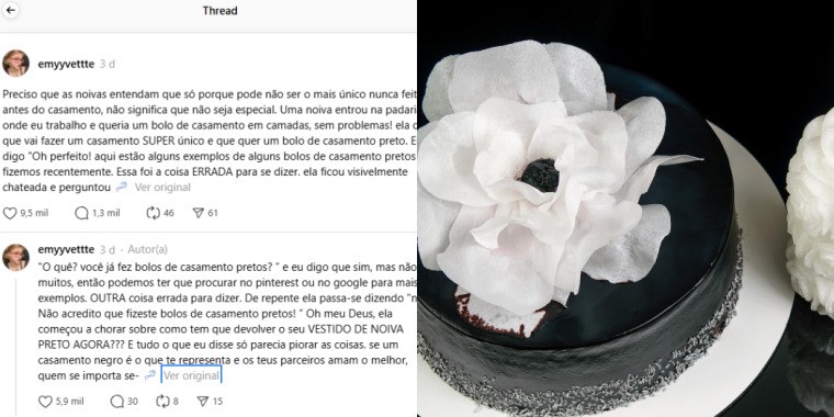 Publicação viralizou e atraiu diversos comentários de clientes que já tiveram experiências semelhantes Uma publicação no Threads viralizou ao relatar a reação de uma noiva que pretendia encomendar um bolo de casamento preto, acreditando que a escolha era inédita. O relato, feito pela confeiteira Emy Yvette, alcançou mais de 395 mil visualizações, 9,5 mil curtidas e gerou diversos comentários sobre referências e escolhas de casamento fora do padrão.