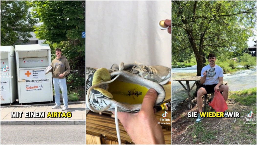 O criador de conteúdo Moe.Ha colocou o dispositivo de rastreamento Apple AirTag — que permite aos usuários localizar itens usando o aplicativo Find My da gigante da tecnologia — dentro da sola de um velho par de tênis Asics. Então, depositou os calçados em uma caixa de doação de roupas da Cruz Vermelha, em uma rua na cidade alemã de Starnberg.